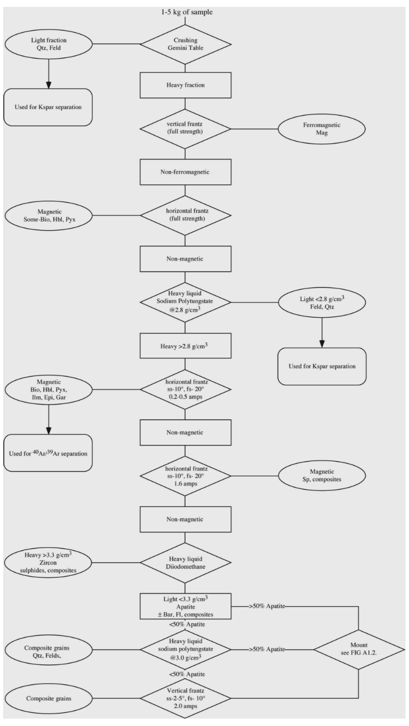 Figure A.1:Flow chart of apatite mineral separation. Qtz=quartz, Feld=feldspar, Kspar=potassium feldspar, Mag=magnetite, Bio=biotite, Hbl=hornblende, Pyx=pyroxene, ilm=ilmenite, Epi=epidote, Gar=garnet, Sp=sphene, Bar=barite, Fl=fluorite, ss=side slope, fs=forward slope.