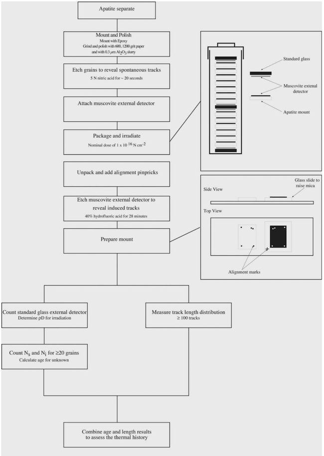 Figure A.10:Flow chart of procedure for fission track dating. \(N_{s}\)=number of spontaneous tracks in unknown, \(N_{i}\)=number of induced tracks in mica external detector, \( \rho_{D}\)=standard glass mica fission track density.