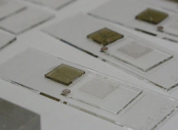 - g) Place teflon square over the zircons and cover with the blank slide.