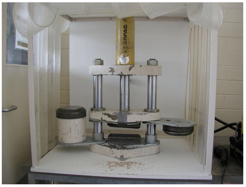 Depending on the rock type, samples will typically range in weight between ~500 g to 3 kg. Hard rock samples must first be reduced to a size suitable for the grinding machine in use. Large samples should be reduced in size with a sledge hammer or hydraulic splitter (Figure A.2), followed by processing through a large laboratory Rocklabs® jaw crusher (Figure A.3).