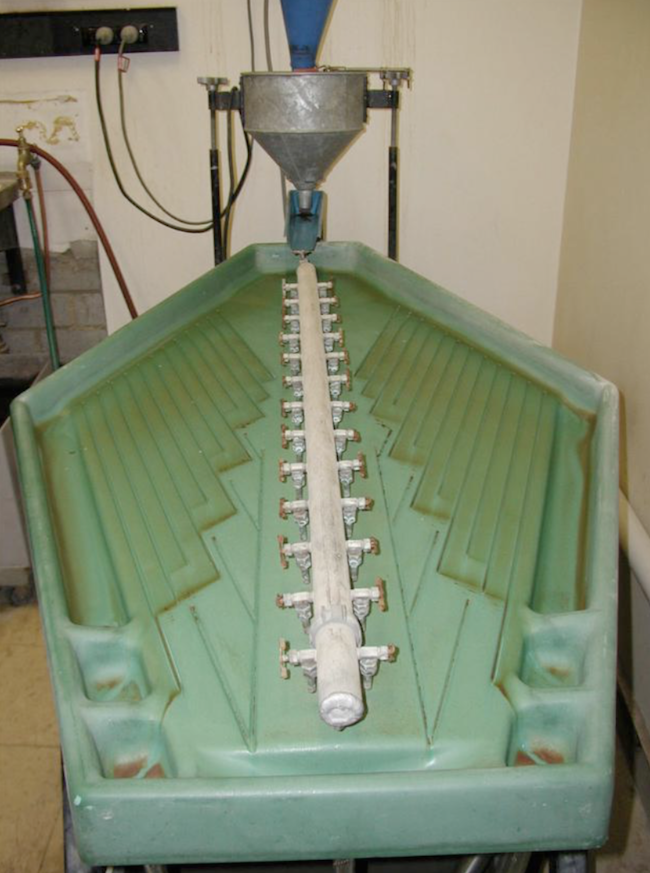 If a Gemini® table is available it can greatly enhance the speed with which large samples (several kilograms) can be processed and cuts down considerably on the volume of heavy liquid required. The sample can be taken from the either the grinding (2.2) or sieving steps (2.3) and placed directly into the auto-feed hopper of the Gemini Table. Prior washing of the sample is not necessary. The shaking motion of the table, the water feed and the side and forward slope can be adjusted to maximise the heavy fraction. This results in a much reduced sample size for the next steps, which is especially advantageous in the heavy liquid processing.