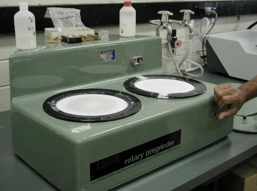 - Adjust the grinding mill to produce material less than about 500 um in diameter. This will vary depending on the type of mill used, the degree of wear on the grinding plates, the hardness of the rock, etc. With experience it is often possible to skip the following sieving step (2.3).