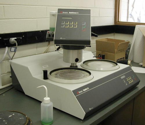 - d) For final polish use grade ‘A’ 0.3 um alumina (Al2O3) slurry in water on a rotating nylon cloth lap on the Metaserv®Rotary Pregrinder. Best results are obtained using a moist lap (not wet) with moderate-hard pressure. If slurry is too thin, polishing will not be efficient. Do not allow the lap to dry out but renew the slurry from a squeeze bottle about every 45-60 secs. The final polishing stage should take about 30-60 secs. And should remove most scratches and pits.