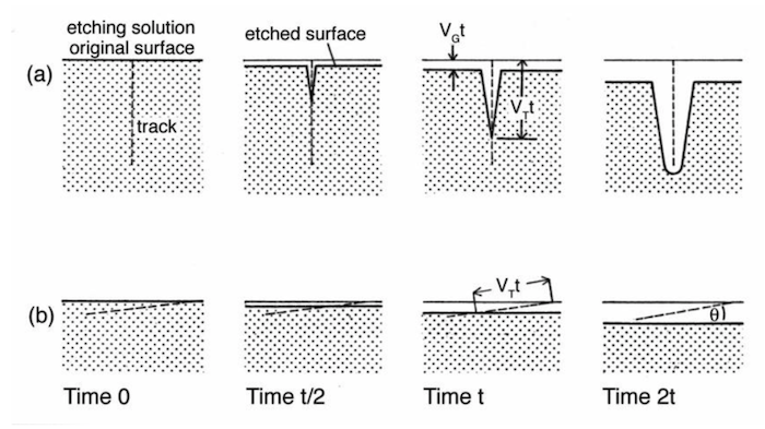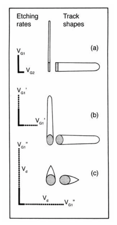 Fission tracks are revealed by chemical etching in a track-recording material because the etchant preferentially attacks the highly disordered material in the core of the track. To produce an etched track, therefore, the rate of etching along the track, \(V_T\), must be greater than the general etching rate of the surface, \(V_G\). The shape of the resulting track etch pit, in the first instance, depends on the difference between these two etching rates as illustrated in Figure 2.1(a). Where \(V_T\) is much greater than \(V_G\) the track will have the shape of a long, essentially cylindrical tube. If the two etching rates are similar (but \(V_{T} > V_{G}\) a shallow, conical etch pit results.