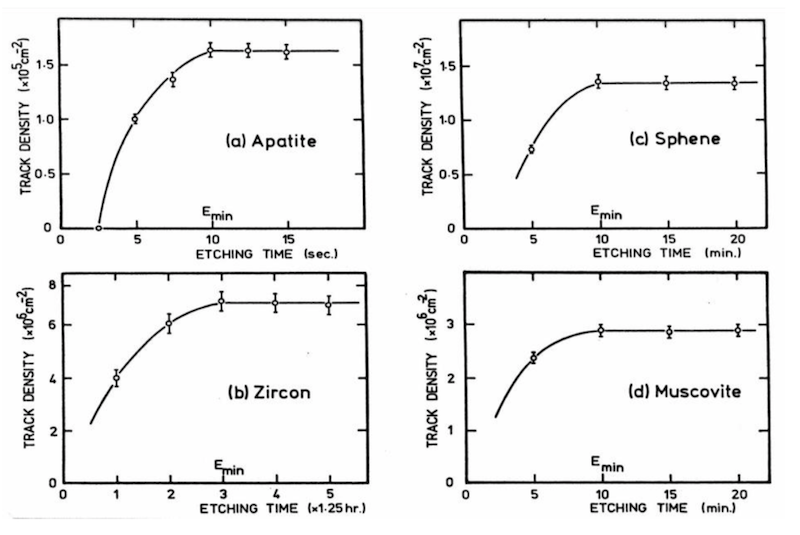 The way in which track density varies with etching time in minerals is illustrated in Figure 2.10. It can be seen that for each of the four minerals, the observed track density rises relatively rapidly to a plateau value which is maintained during further etching. The minimum acceptable etching time, \(E_{min}\) is the time taken to reach the beginning of the plateau. The appearance of the tracks in sphene and zircon after each etching treatment is shown in Figure. 2.11 and 2.12. These may be used to judge when tracks in an unknown sample have been adequately etched. The optimum etching time is usually about 1.5 to 2 times \(E_{min}\) for a particular mineral sample, giving tracks approximately 1 μm in diameter. An extremely useful exercise for a novice in fission track studies is to carry out just such a progressive etching experiment to gain direct experience of the appearance of tracks which are adequately etched. The correct etching time in minerals such as zircon and sphene, is highly variable and will depend on a variety of factors, especially the general radiation damage level. It is extremely important in these minerals that the degree of etching be judged from the appearance of the tracks and not from the application of some standard etching time. Apatite is more consistent in its etching behaviour and a standard etching time can often be used, although exceptions will be found from time to time.