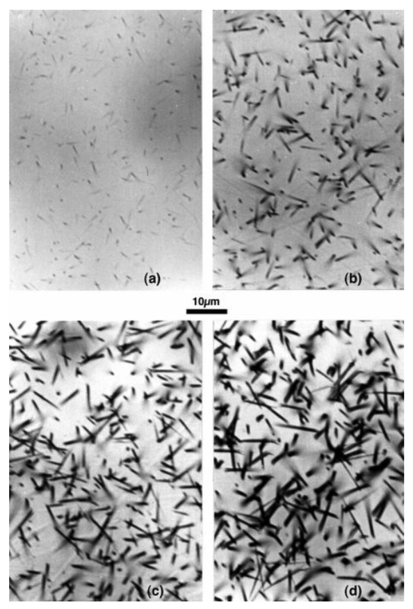 Figure 2.11: The appearance of spontaneous tracks in sphene after various etching times. (a) to (d) show tracks etched for 5, 10, 15 and 20 minutes respectively in the acid etchant (Table 2.1). The tracks in (b) represent the minimum degree of etching (\(E_{min}\)) for which a reliable track density is obtained.