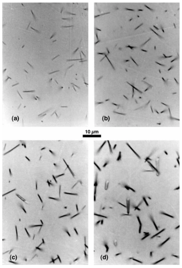 Figure 2.12: The appearance of spontaneous tracks in zircon after 2.5, 3.75, 5 and 6.25 hours in 100N NaOH at 270°C; (a) to (d) respectively. Again the tracks in (b) represent the minimum acceptable degree of etching for reliable counting.