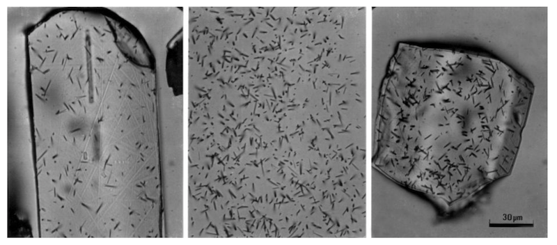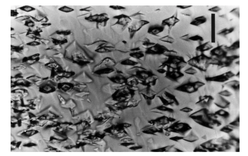 Figure 2.2: Etched fission tracks in (a) apatite, (b) muscovite and (c) zircon, all to same scale. (a) and (c) show spontaneous tracks, (b) induced.