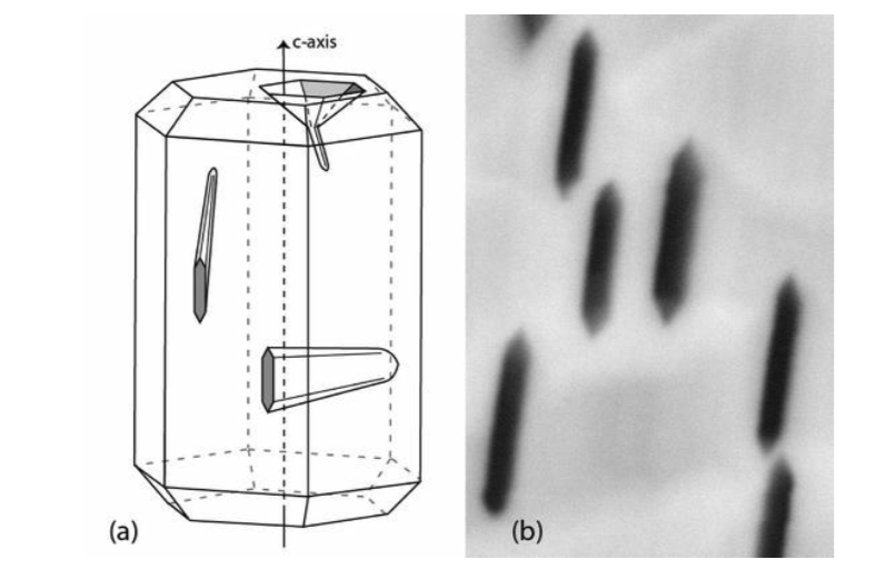 Figure 2.3: The shape of etched fission tracks on different crystallographic surfaces in a hexagonal apatite crystal. (a) shows the shape of tracks on surfaces normal to, and parallel to the c-axis, and (b) shows the shape of track etch pits on a c-parallel surface under a Scanning Electron Microscope (the etch pits are ~ 1.5 μm long). The narrow hexagonal outline of the anisotropically etched tracks can clearly be seen.