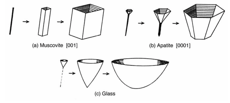 Figure 2.4: The shape of etch pits which result from prolonged etching of fission tracks in different materials.