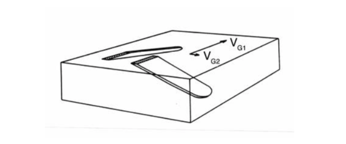When the general etching rate, \(V_G\), of a material is anisotropic, the etching efficiency will still be high where \(V_T\) is much greater than the value of \(V_G\) normal to the surface. The track cross-section, however, will be controlled by variations in \(V_G\) in other directions as illustrated in Figure 2.6. Within the plane of the etched surface the anisotropic etching rates are described in terms of two different components \(V_{G1}\) and \(V_{G2}\). The size and shape of the two tracks are quite different and so is their visibility after normal etching conditions. Some tracks have the shape of knife blades so that their visibility will in part depend on the direction from which they are viewed. In some cases of extreme anisotropic etching, such as in young sphenes, tracks in certain orientations may be so weakly developed as to be invisible under normal etching and observing conditions.