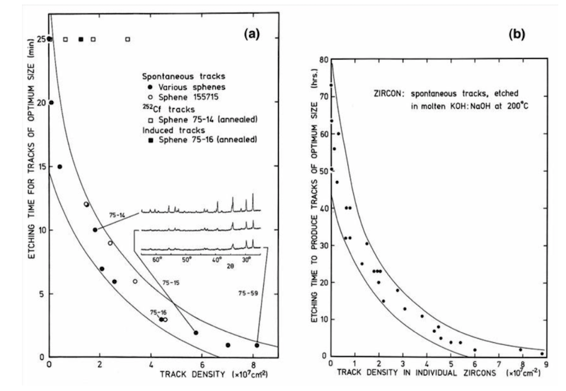 The most obvious change caused by this damage is a dramatic reduction in the time taken to etch the tracks with increasing track density, as shown in Figure 2.8 for sphene and zircon. This change in etching rate with radiation damage tends to accentuate any uranium zoning which is quite common in zircon and sphene. This can be seen in Figure 2.8(b) that shows a zoned sphene crystal, the adjacent zones varying from underetched to overetched depending on the track density. No such relationship has ever been observed for apatite, however, which is thought to reflect a low stability for the alpha-related damage in this mineral, so that it does not accumulate over geological time. It is significant in this regard that apatite has never been observed in the metamict state, unlike both zircon and sphene.